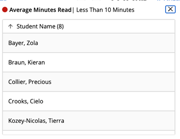On the right, each student’s average minutes read for the term are displayed and color-coded.